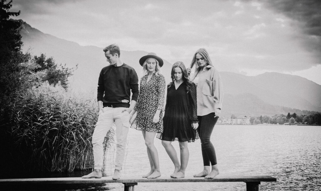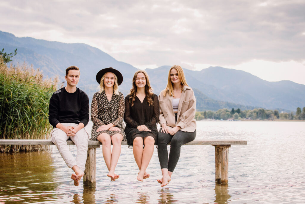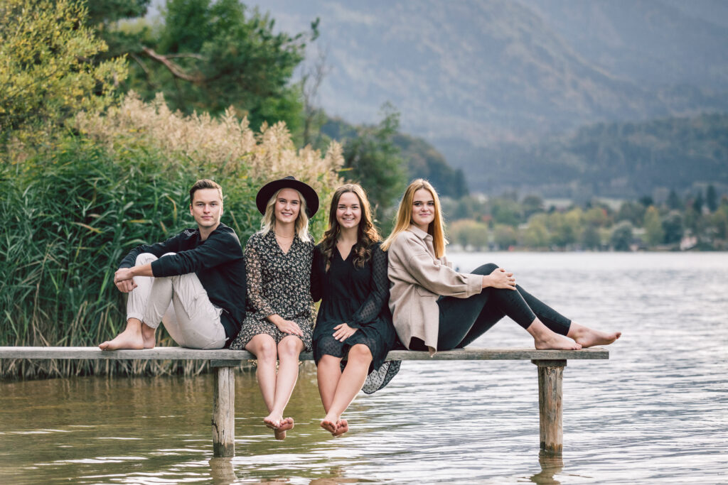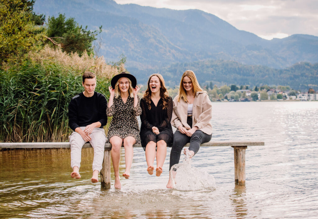So ein Outdoor Shooting ist immer besonders und immer anders. Man spürt den Wind in den Haaren, man riecht die Bäume, Blätter, Farne, der weiche Untergrund unter den Füßen – ein Outdoor Shooting ist immer ein Erlebnis für alle Sinne. Die Vier haben natürlich gleich ausprobieren müssen, wie lange man mit den Füßen im herbstlich kühlen Faaker See Wasser plantschen kann. Ich glaub, die haben sich wieder gefühlt wie kleine Kinder. Das Geschenk ist sicher gut angekommen und hat viel Freude gemacht.
